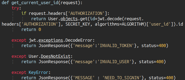 get_current_user_id는 사용자가 로그인을 한 상태라면 users 테이블 상의 id를, 아니라면 0을 반환하는 함수다. 에러가 났을 당시에는 바로 찾지 못했지만, 이 목적만 봐도 아래 코드에서 틀린 점을 찾을 수 있다. exception 처리 코드를 여기저기 옮기다가 실수로 잘못 붙여넣은 게 하나 보인다.